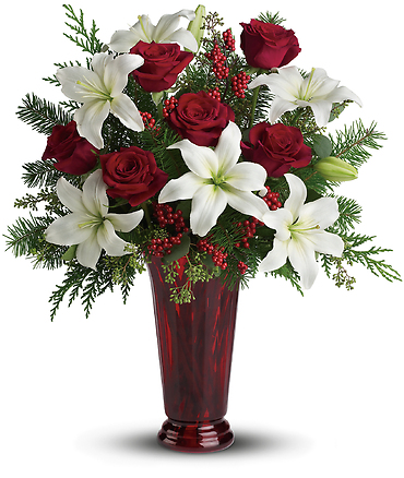 Send a touch of holiday magic to a special friend, or add some to your own home. An elegant Christmas arrangement of white asiatic lilies, red roses and Douglas fir, this fabulously fragrant gift lends seasonal sparkle to any room.